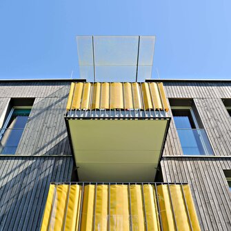 Tato fasáda přitahuje pohledy: šikmý "zebra-look" dodává nástavbě život...